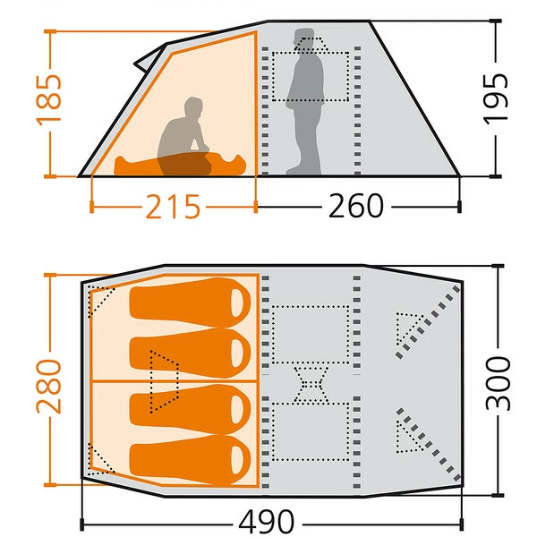 Das Innenzelt bietet ein großes Raumangebot für vier Personen und verfügt über insgesamt vier Netzseitentaschen in denen Brillen, Bücher, Lampe und andere Kleinigkeiten ihren Platz finden. Eine Stoffbahn separiert das Innenzelt, wodurch zwei mal zwei Schlafplätze entstehen. Der Stoff kann bei Nichtgebrauch nach oben gerollt und fixiert werden. Ein großer Lüfter mit Moskitonetz sorgt für ausreichend Belüftung im Innenzelt.