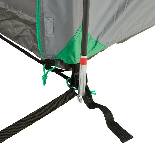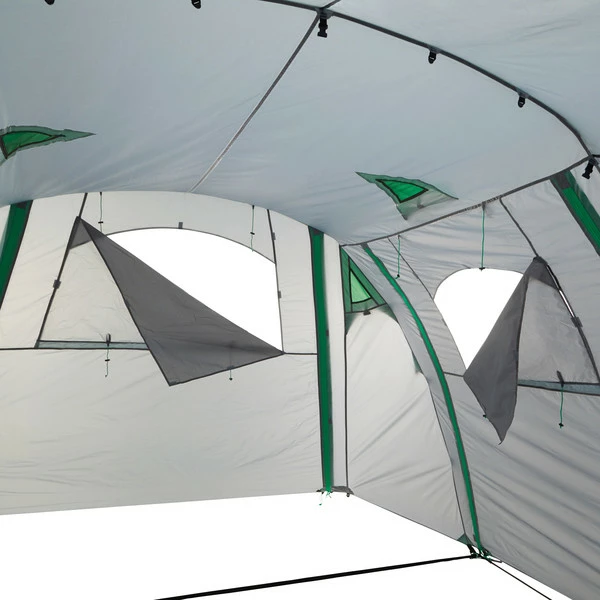 In der Apsis ist Platz für Ausrüstung oder einen kleinen Tisch mit Stühlen. Bei schönem Wetter lassen sich alle drei Eingänge aufrollen oder mit den im Lieferumfang enthaltenen Aufstellstangen aufstellen. Das Aufstellen sorgt nicht nur für besseres Klima und schönen Ausblick, sondern dient gleichzeitig als Sonnenschutz. Jede Tür verfügt über ein eigenes Fenster, das mit Stoff verschlossen werden kann.