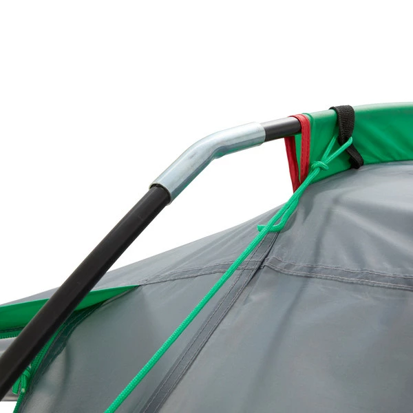 Das preiswerte Familienzelt lässt sich durch markierte Stangen und Gestängekanäle problemlos aufbauen. Trotz der Größe gelingt der Aufbau mit zwei Personen schnell. Das Innenzelt kann beim Aufbau im Außenzelt verbleiben. So wird es auch bei Regen nicht nass.